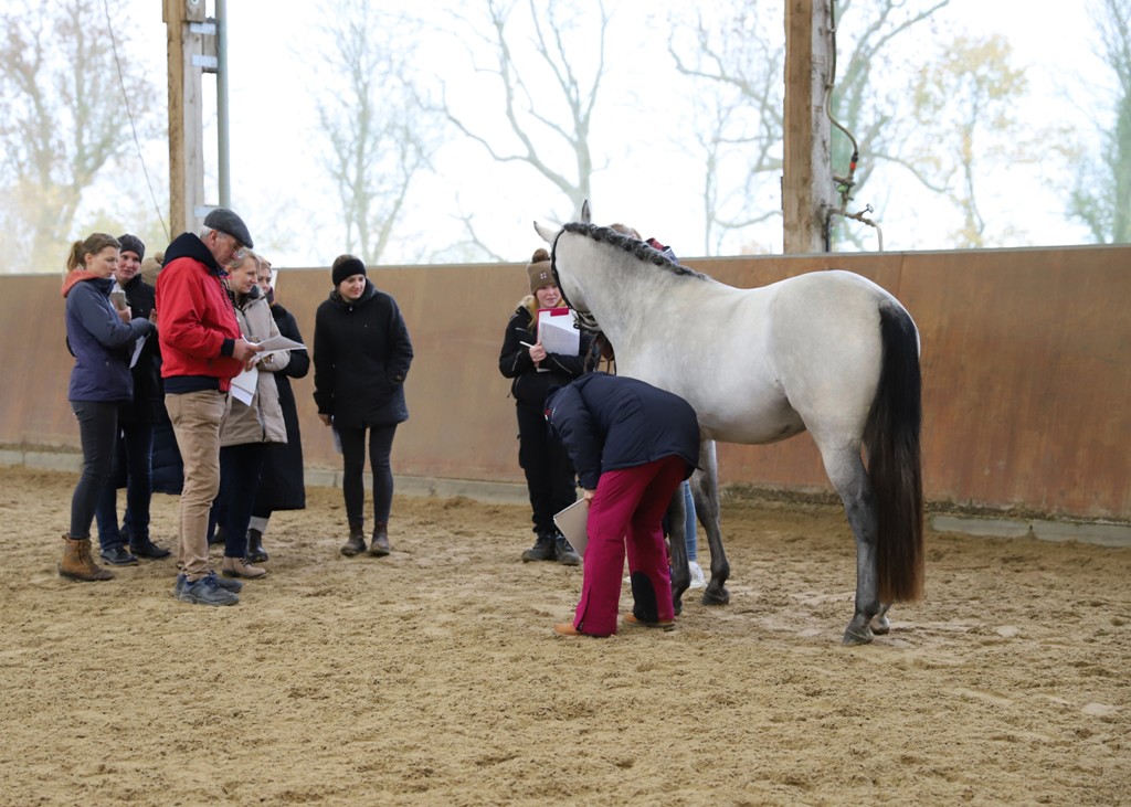 Den Lehrgangsteilnehmern wurden von Frau Carina Wacks vom 2,5-jährigen Hengstanwärter über ein Reitpferd bis zum 20 jährigen Englischen Vollblüter drei gut herausgebrachte Pferde vorgestellt.