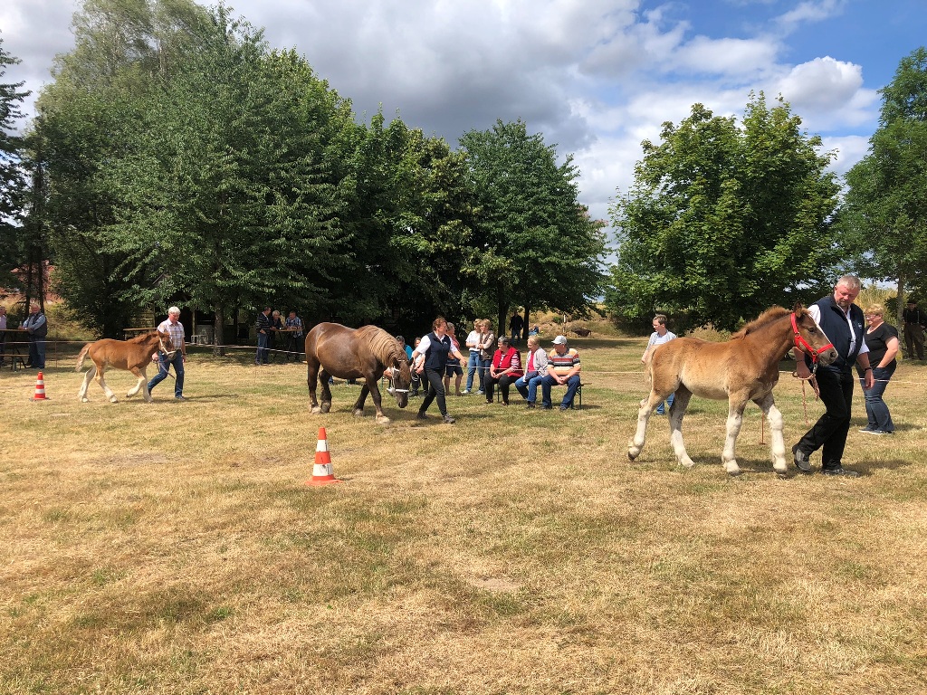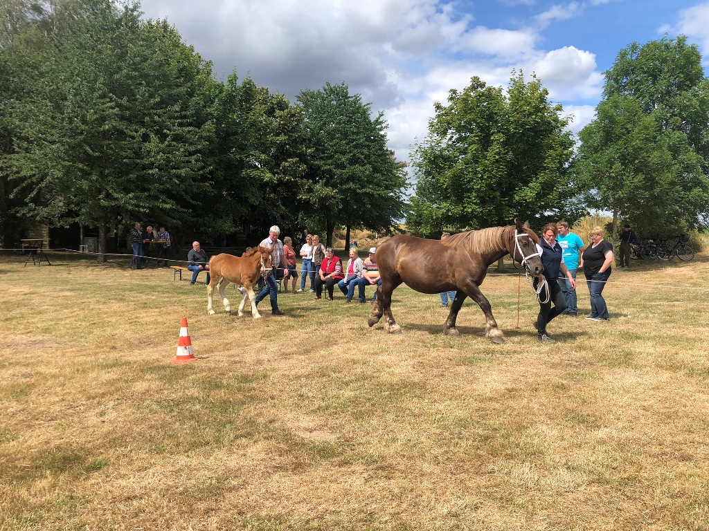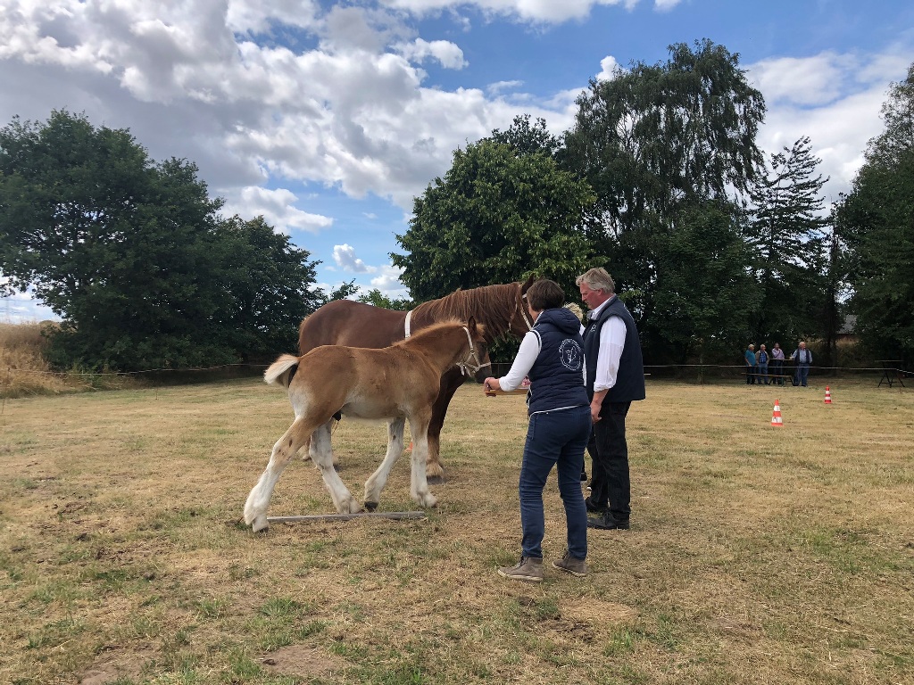 Danach ging`s weiter nach Stolzenau zu Familie Kohlmeyer. Hier hatten sich wie jedes Jahr diverse Zuschauer aus der Umgebung am Bahnrand eingefunden, um bei der Beurteilung der Schleswiger Fohlen und einer jungen Stute zuzuschauen und zu "fachsimpeln". Inzwischen zeigte sich auch die Sonne mit voller Kraft. Die junge Stute und auch die Fohlen konnten auf dem sehr trockenen Grasplatz ihre Möglichkeiten und Qualität nicht immer ganz entfalten. Einige Fohlen wurden prämiert.