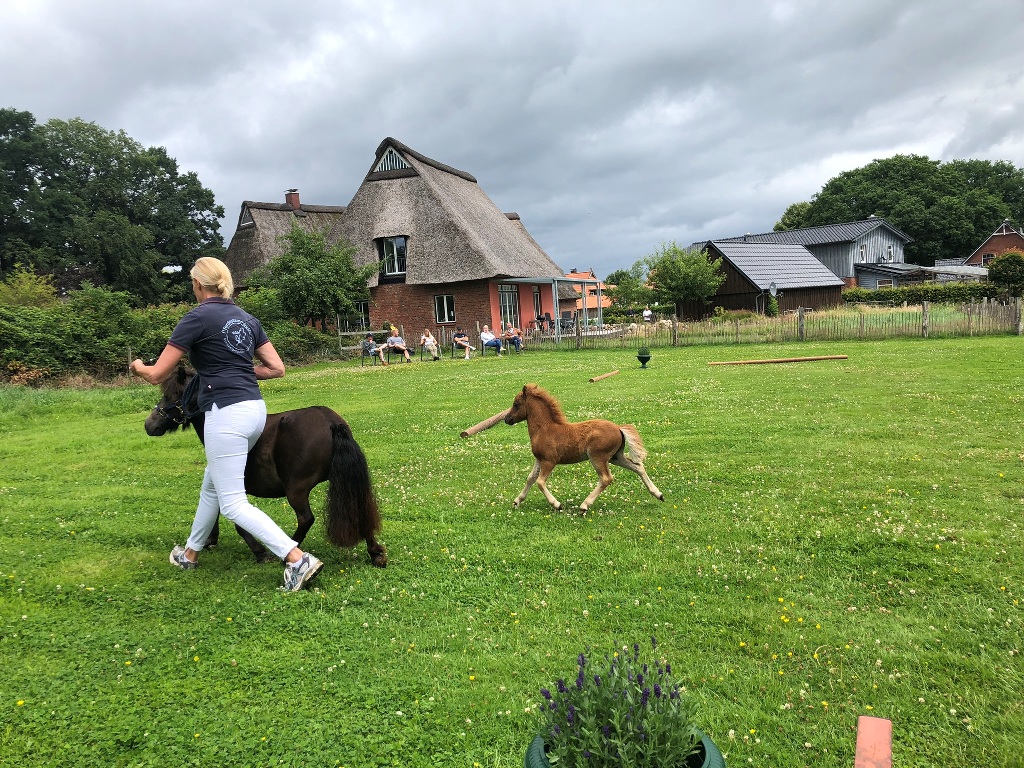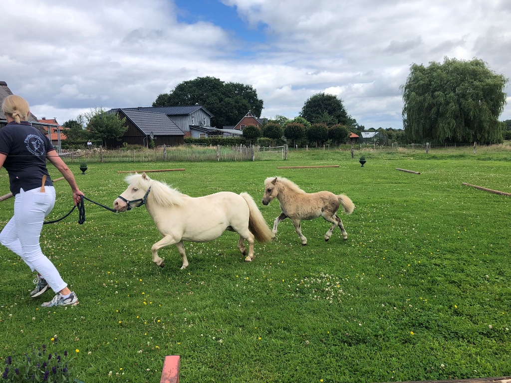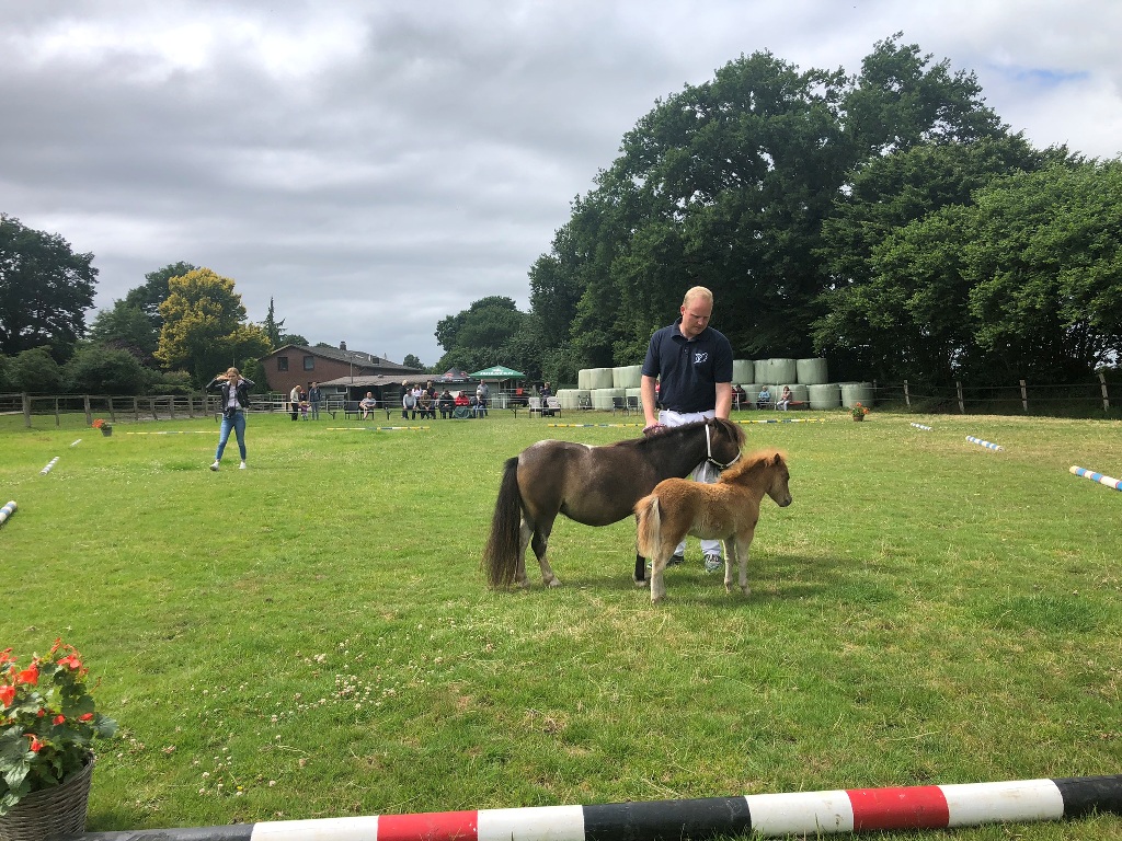 Nächster Termin mit vielen schönen Mini-Shetlandfohlen am Start waren dann Brigitte Schulz-Hütter und Kai-Udo Ties vom Gestüt Herrenhof in Hüttblek. Hier hatte sich fachkundiges, sehr gut gelauntes Publikum bei sonnigem Wetter eingefunden. Fast alle Fohlen - sehr bewegungsstark und ausdrucksvoll - konnten mit einer Prämie ausgestattet zurück in ihren Stall. Herzlichen Dank für die sehr leckeres Mittagsstärkung im Anschluss der Registrierung auf dem Hof.
