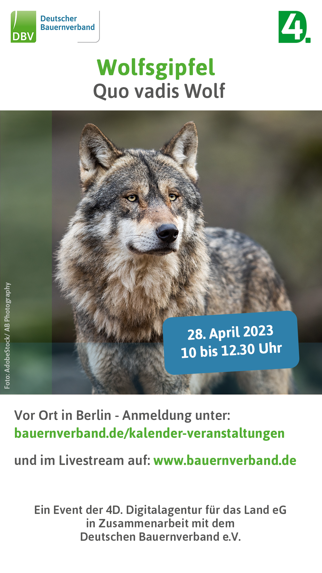 Beim Wolfsgipfel der 4D. Digitalagentur für das Land eG in Zusammenarbeit mit dem Deutschen Bauernverband und der Deutschen Reiterlichen Vereinigung e.V. am 28.04.2023 soll eine ehrliche Bestandsaufnahme zum Thema Wolf und Weidetierhaltung durchgeführt und erforderliche Schritte für eine Regulierung des Wolfsbestandes diskutiert werden. Hierzu laden wir Sie herzlich ein.