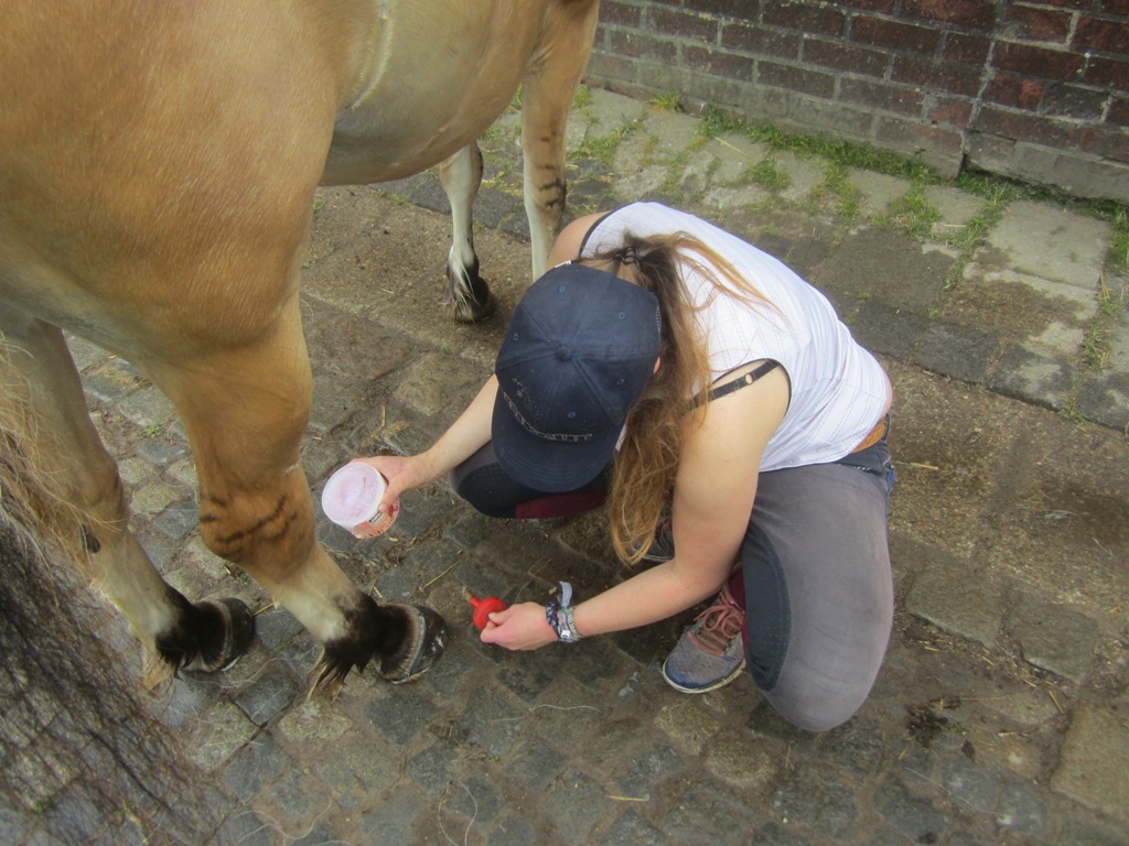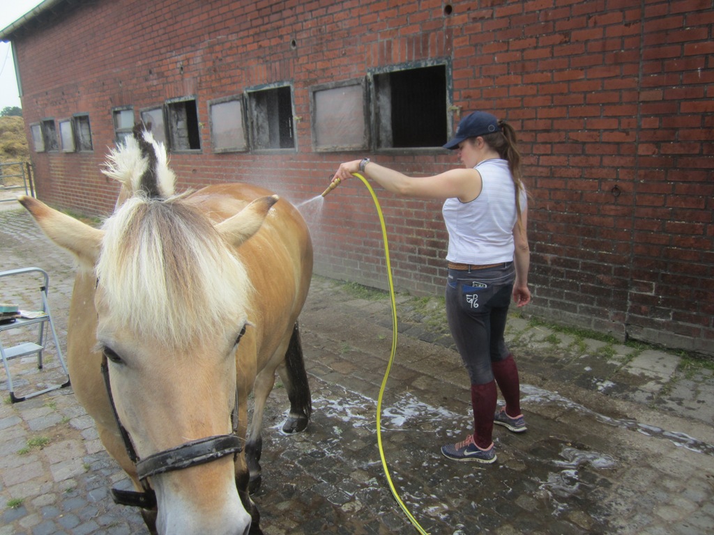 Am 18. Juni 2018 waren wir deshalb zur Stuteneintragung in Felde! Das war ein Grund, das ganze Pony von Kopf bis Fuß zu waschen. Normalerweise wasche ich Koletta nach dem Reiten mit der Waschbürste ab, aber an diesem Morgen machte sie ihre erste (?) Erfahrung mit dem Wasserschlauch und war dabei völlig entspannt.