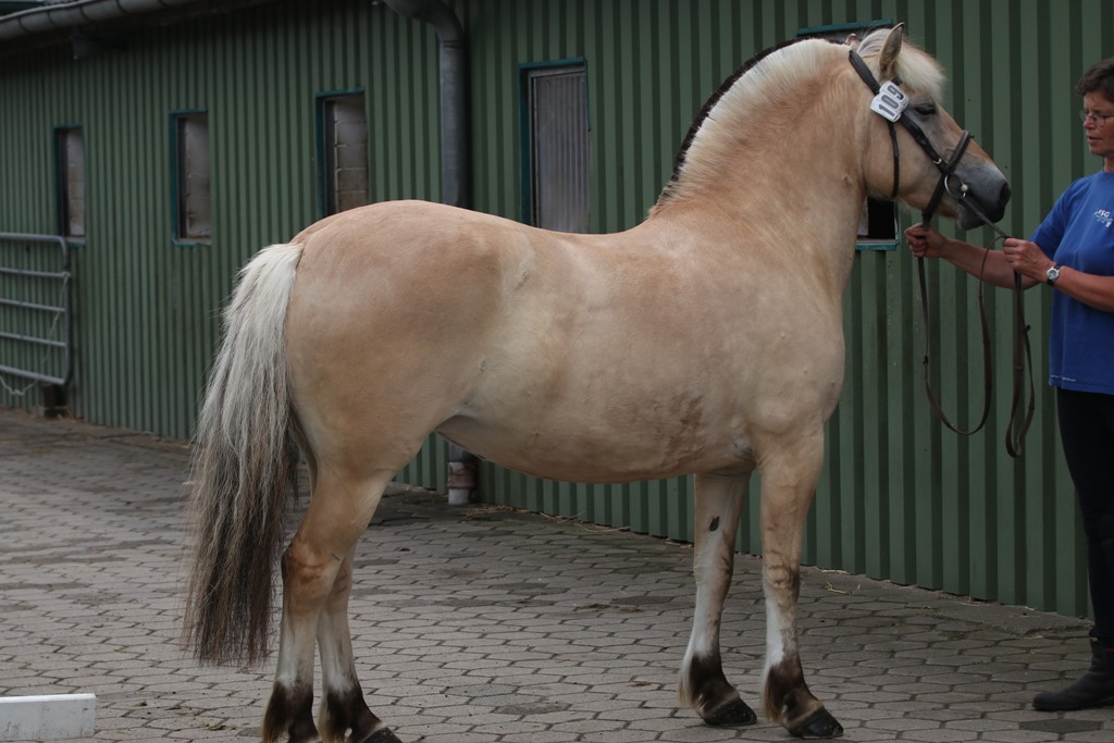 So, und nach einem kurzen Abstecher zur Bäckerei unseres Vertrauens – zu Unternehmungen mit Pferden gehört bei uns traditionell eine Rumkugel - fuhren wir mit dem pieksauberen, durchgestylten Pony nach Felde, wo überraschend viele Fjordstuten auf ihre Eintragung warteten. Koletta war mit ihren (fast) fünf Jahren klar die Älteste. Zunächst wurde sie per Chiplesegerät und Wirbelschema identifiziert und dann gemessen: 146 cm Widerristhöhe (zwei mehr als im Vorjahr in Niedersachsen!) und ein Brustumfang von 193 cm - das war natürlich Wasser auf die Mühle meiner Tochter, die eh täglich bemerkt, Koletta sei zu dick ...