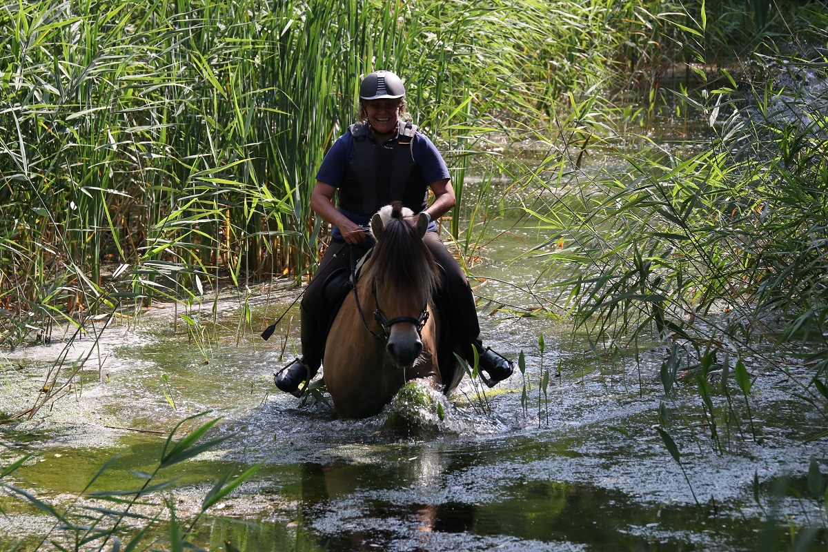 Jarle war schon sehr müde, da wir aber viel Spaß am Geländereiten haben, gab sie nochmal alles und zog sogar auf den Wasserdurchritt, der eher ein Modderloch in einer Senke ist, ordentlich an.