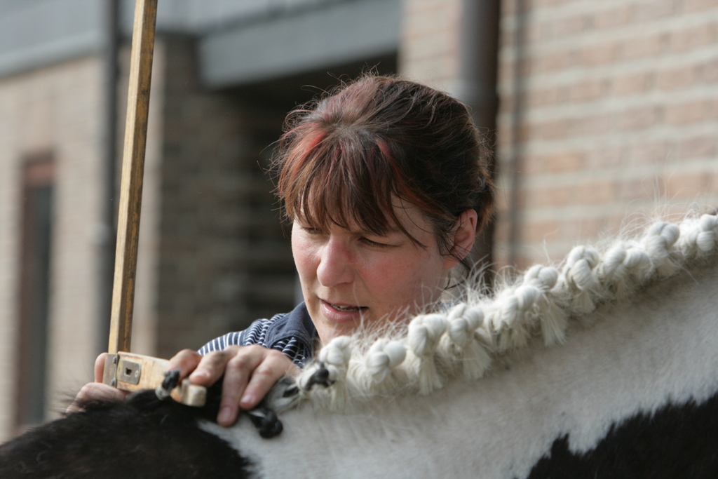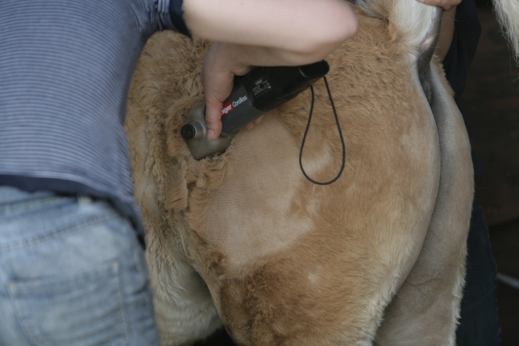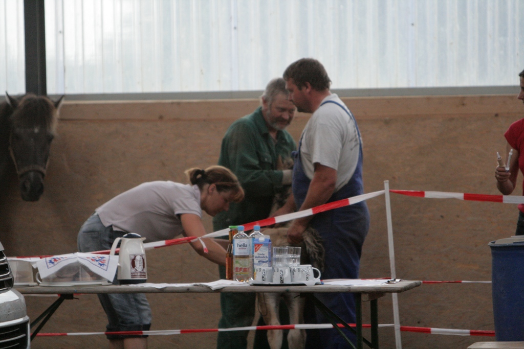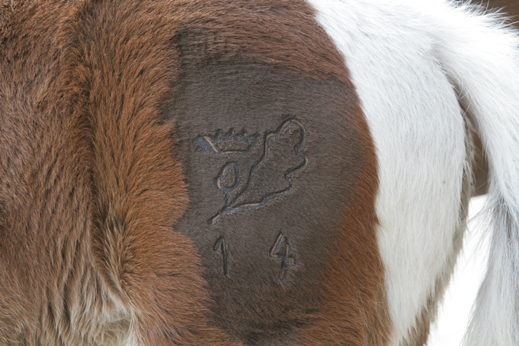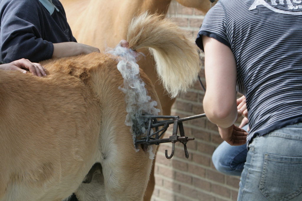 Nach der Chip-Prozedur kam dann noch das Brennen. Auch hier war natürlich Standard gefragt. Das Eisen bereits vor dem Chippen fertig machen und mit der richtigen Nummer versehen, um dann das Brennen schnell erledigen zu können. Für das Brennen selbst brauchten, wie alle wissen, die Fohlen meistens nicht so fixiert zu werden. Nur beim Scheren der Brennstelle war noch mal "Man Power" gefragt.