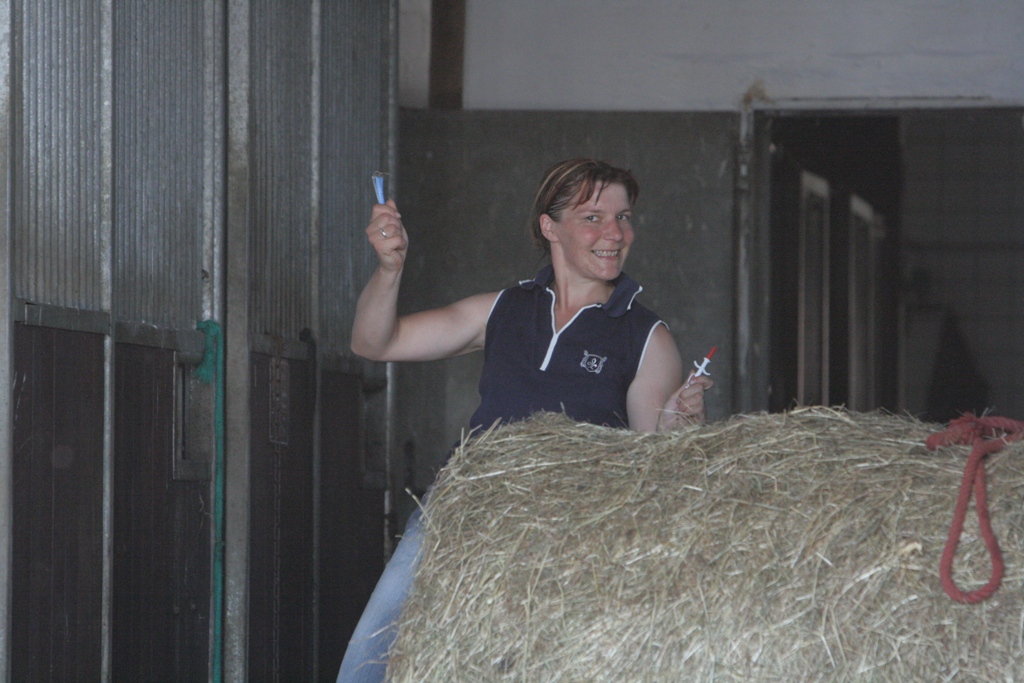 Es war logisch, dass zuerst gechipt werden mußte, denn die Fohlen sollten bei der Prozedur so still wie möglich halten. Claudia entwickelte auch hier einen Standardsatz, den jeder Züchter zu hören bekam und vielleicht heute noch im Ohr hat: „Ich brauche die linke Seite zum Chippen! Sie stehen auf der rechen Seite des Fohlens. Fassen sie mit der rechten Hand unterm Hals durch und packen das linke Ohr des Fohlens! Und das gut festhalten!“