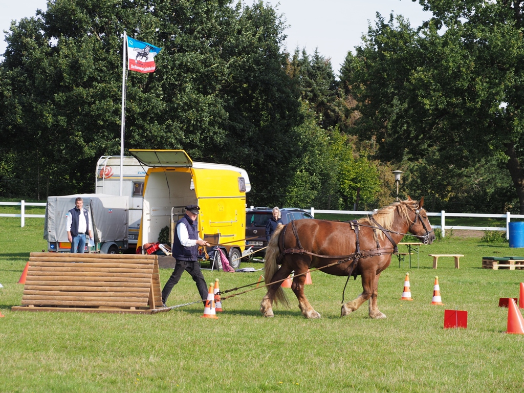 Bei sonnigem Wetter wurde zuerst der Vereinsmeister im Schleppen ermittelt. Der amtierende Vereinsmeister Hans-Jürgen Schnack konnte wegen einer Verletzung seiner Stute nicht antreten. So blieben sieben Teilnehmer, die mit einer Schleppe von 1,22 durch 1,60 breite Hinternisse den Parcours durchfahren mußten. Hier setzte sich Kristina Frahm mit ihrem Wallach Brutus an die Spitze und wurde nach Else Laursen und Anja Peters die dritte Vereinsmeisterin des VSP.