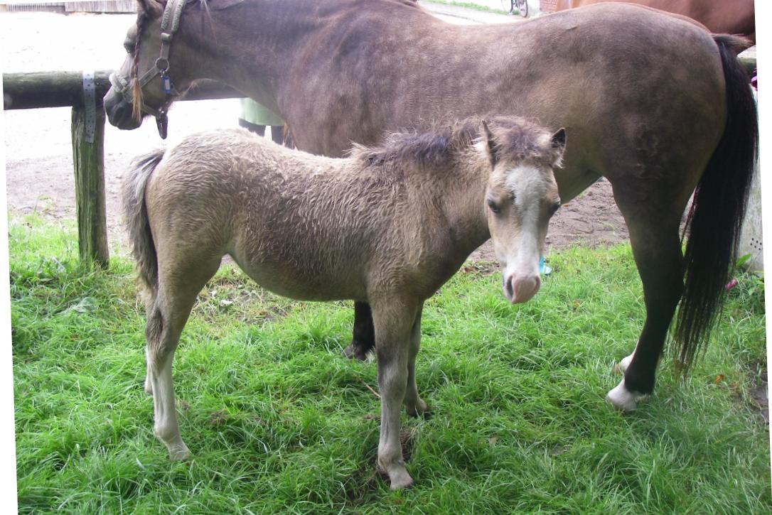 Ghana hat bei den Vorbesitzern nie ein Fohlen bekommen. Bei uns wurde sie von York gedeckt und wurde tragend. Und bekam zwei Stutfohlen: Ponyland Gaiety, braun, (hat vor der Kutsche die Leistungsprüfung gewonnen) und Ponyland Golden Girl, die inzwischen Staatsprämienstute ist.