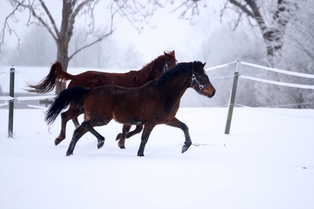 Die Ponys toben auf der Koppel, wälzen sich vergnügt oder suchen den letzten Grashalm unter der Schneedecke. Alle anderen werden vorm Schlitten gespannt oder galoppieren mit Meike durch den Schnee.