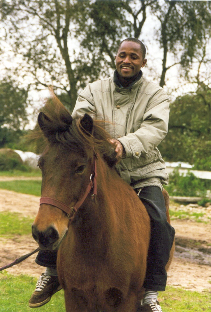Später wurde er noch gefragt, ob er denn gerne auf einem Islandpferd sitzen wollen würde. Oh ja, er wollte.Und so kam es, dass unser Pferdestammbuch Praktikant aus Afrika auf einem Islandpferd des Gestütes Vierthohen in Weddelbrook zu sitzen kam und sichtlich großes „Reit“-Vergnügen hatte. Auch wenn es nicht die Stute war, in die er sich verguckt hatte.