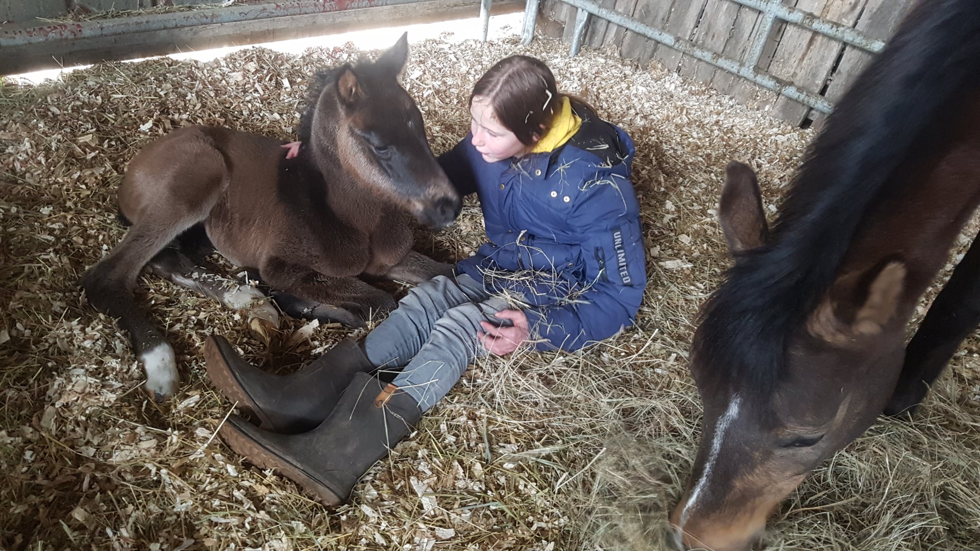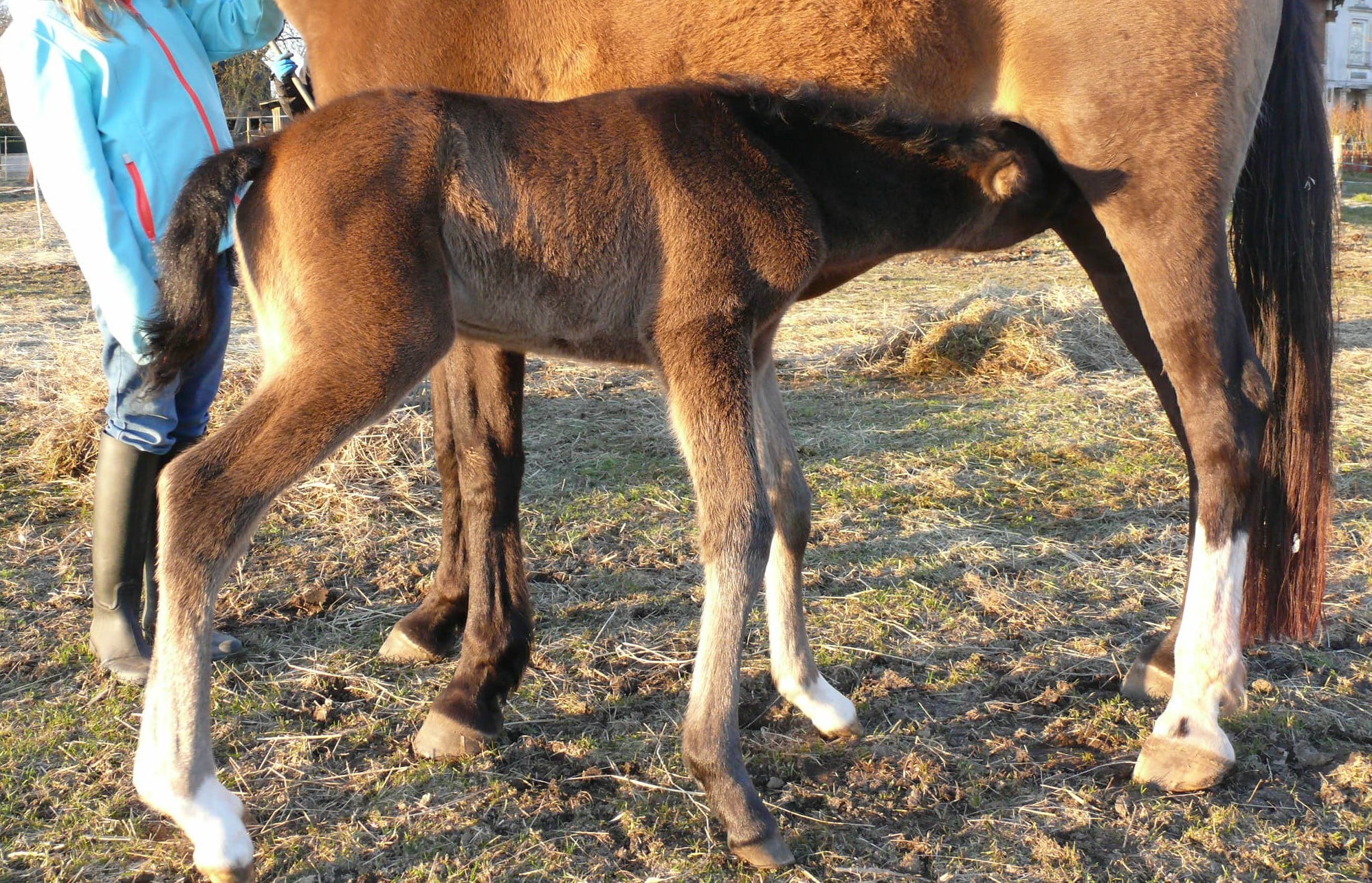 Nachdem sie über eine Stunde Marathon in der Box gelaufen war, war ich froh über eine problemlose Geburt und ein extrem agiles Fohlen, was (die Hinterbeine noch in der Eihaut) direkt die Beine vorschob und den Kopf nach oben reckte. Bei einer kurzen Kontrolle des Nabels entdeckte ich zwei kleine Zitzen und freute mich über das Stutfohlen, dass ich kurz darauf zu unserem Rekordmeister im Aufstehen (keine 30 Minuten) und trinken (keine 2 Minuten später) erklärte.