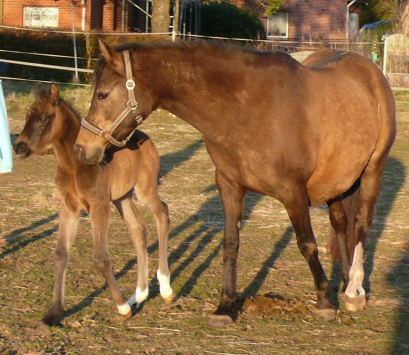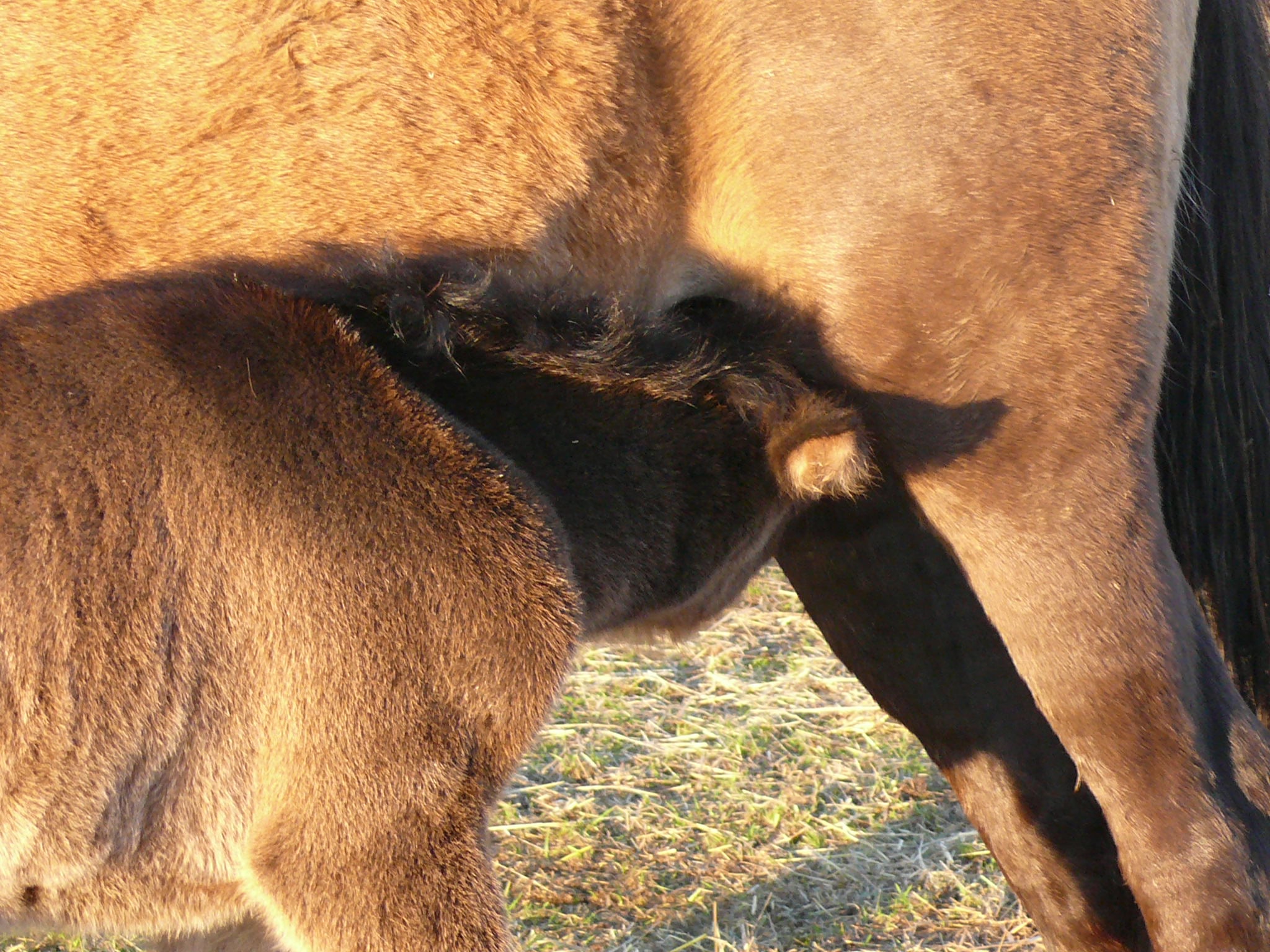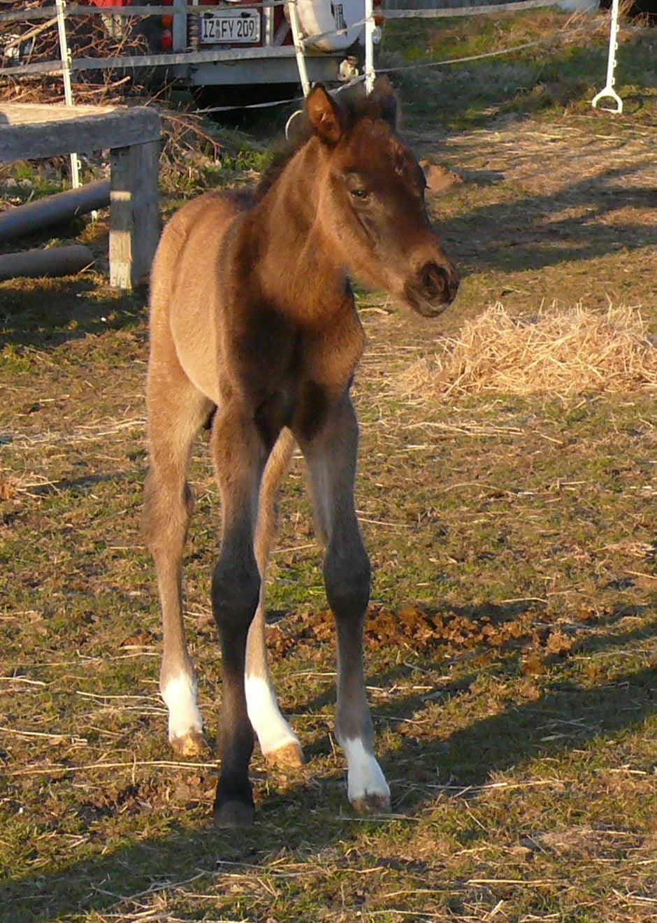 Farblich mag ich noch nicht raten, es kann Grundfarbe braun oder schwarz sein, mit oder ohne Cremegen. 2018 dachte ich, sie hätte ein braunes Stutfohlen bekommen, dass dann zu einem fast schwarzen Buckskin wurde. Das war heller als er bei der Geburt.