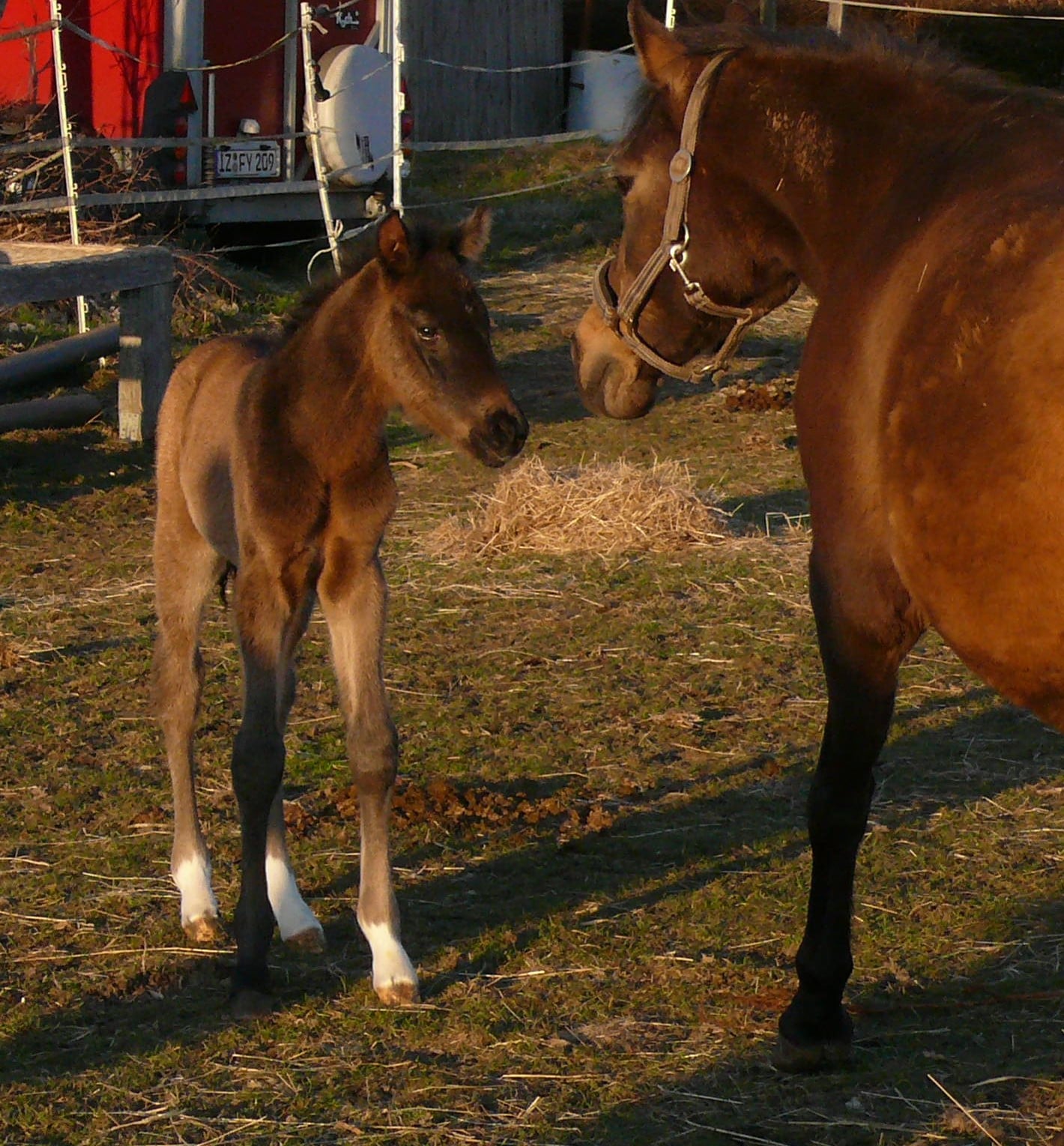 Nachtrag: Die Stute heißt "Ginette", Jahrgang 2005, Champion de Luxe x Dressman I x Folklore. Halbschwester zum Doppelbundeschampion Daily Pleasure WE. Ihre Mutter ist Vollschwester zu Dance Star AT etc. Die Stute gehört zu uns seit Herbst 2017. Eine absolut begeisterte Mutti, die dem Kleinen täglich das Gesicht "wäscht", was er ganz doof findet.