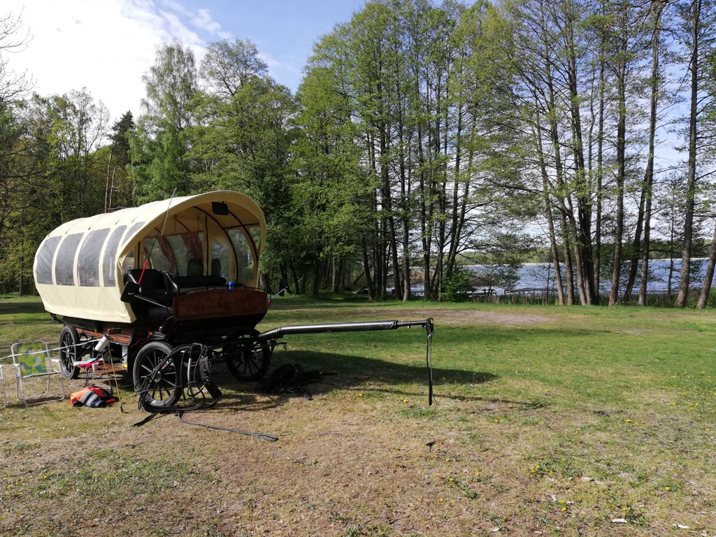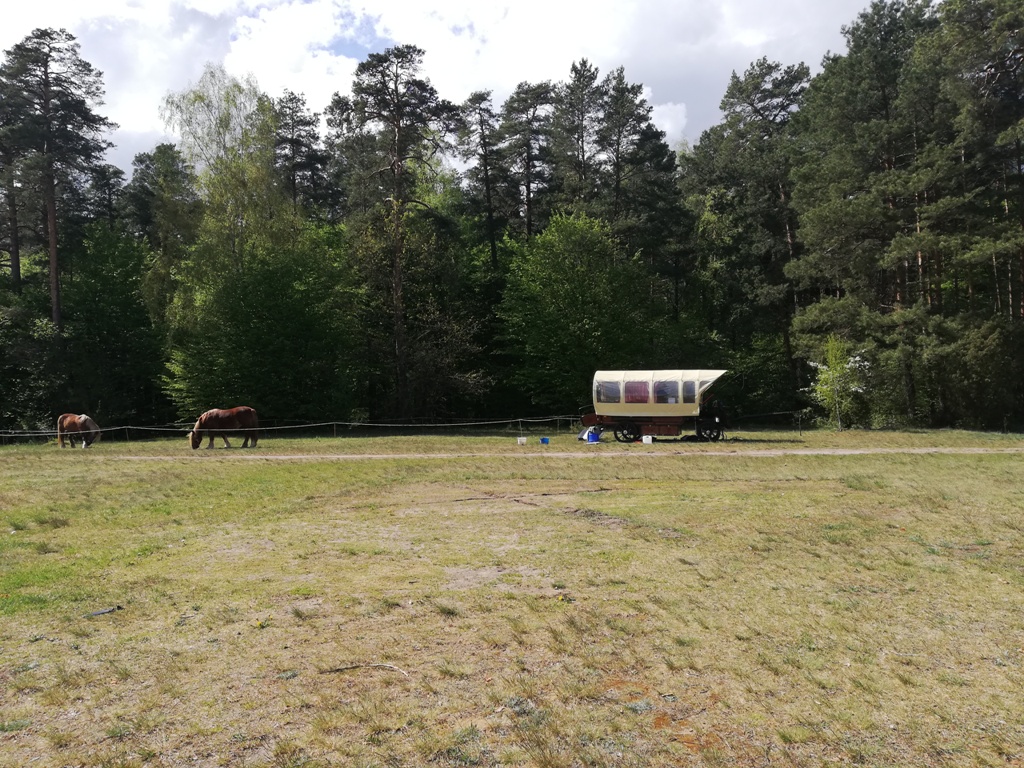 Jetzt im Frühjahr ist da geschlossen. Wir konnten aber trotzdem auf den Platz fahren. Es ist wieder ein toller Platz direkt an einem See. Wir haben dann eine Weide für die Pferde eingezäunt. Es waren auch schon Leute da, um uns zu begutachten. Heute schlafen wir dann wieder im Planwagen.