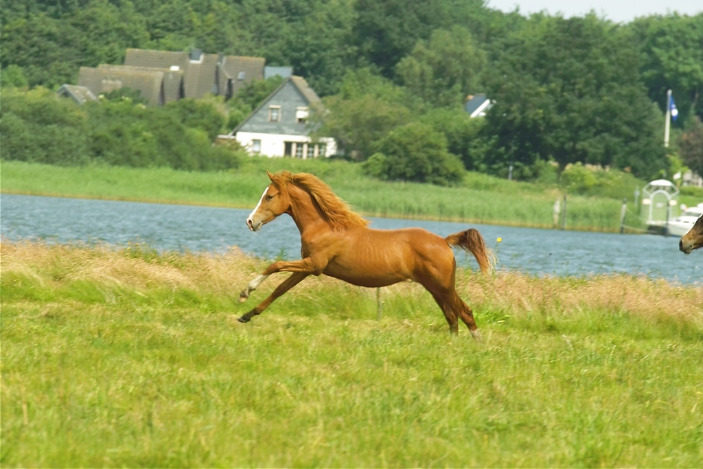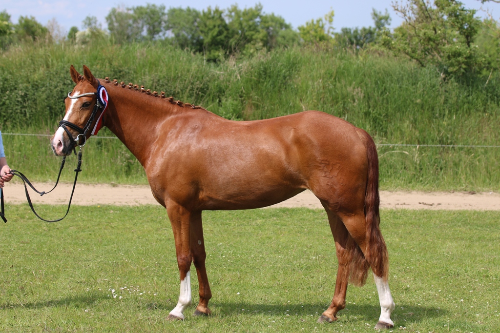 3 Jährig im Frühjahr entwickelte sie sich dann sehr gut, wir entschieden uns, mit ihr zu arbeiten und zu sehen, wohin sie bereit ist mit uns zu gehen. Ihre Leistungsbereitschaft war enorm, sie zeigte viel Mut und Vermögen beim Freispringen und bewegte sich ansprechend. Also nahmen wir sie 3 J. mit zum SH Schaufenster für Nachwuchsturnierponys, hier konnte sie sich mit einer 7,75 an 3.ter Stelle der 3 J. Stuten und Wallache mit Meike Michalowski platzieren. Sie ging dann zur Stutenleistungsprüfung nach Groß Wittensee, die sie als Leistungsstute mit 7,8 abschließen konnte. Im Anschluss ging es für sie bis Herbst auf die Weide.