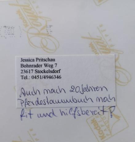Claus hat bei seiner letzten Krankheit Jana seine Stute „Henriette“ überlassen und auch seinen Gestütsnamen „St. Annen“ Dies wurde schriftlich festgehalten. Sein Wunsch war es, dass Jana seine Zucht weiterführt.