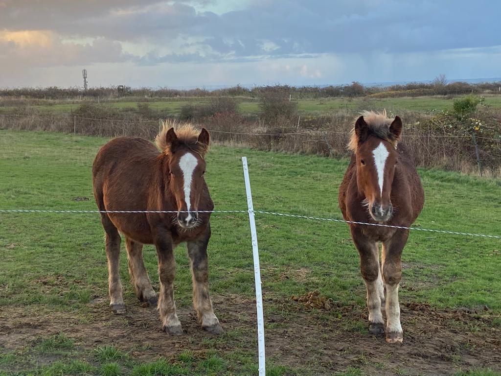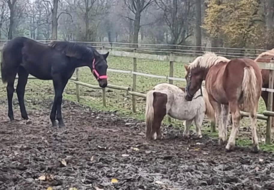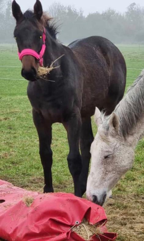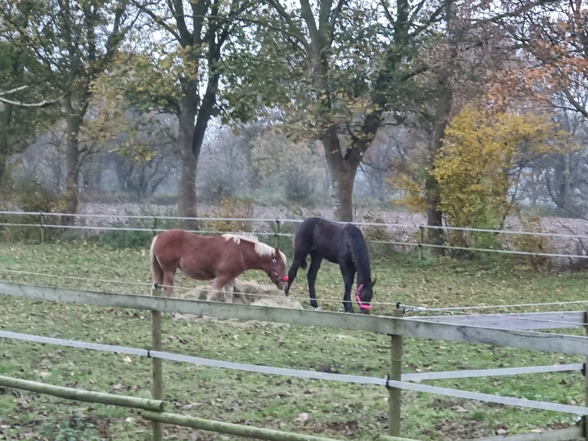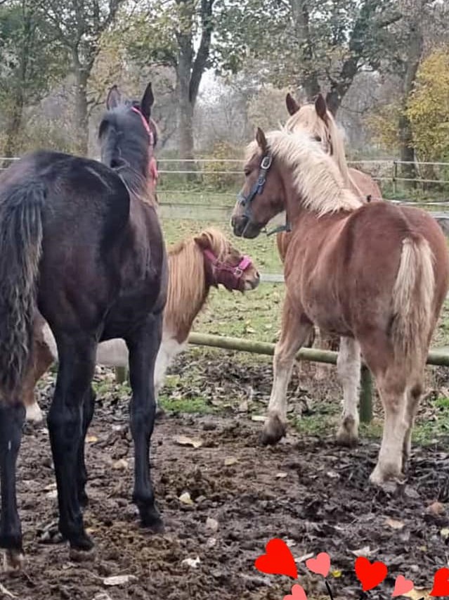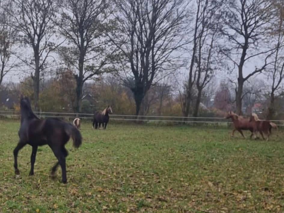 Nach 2 Tagen ließen wir alle zusammen erst auf den Paddock und dann zusammen auf die große Koppel. Nun stehen Panja und Odinchen auf einem Paddock und die großen auf dem anderen mit wechselndem Koppelgang, da Odinchen von einer sehr dominanten Stute fies gemobbt wurde.