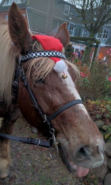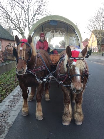 Und weil es coronabedingt ein Erfolg in Klanxbüll war, wurde das Event zum Nachbardorf Emmelsbüll-Horsbüll ausgeweitet. So kam ich in den Genuss, 2 Wochenenden im Dezember 2021 die Feuerwehrkapelle fahren zu dürfen. Die Pferde konnten die Musik auch schon mitsingen. Und auch meine junge Schleswiger Stute Jasira glänzte durch Ausgeglichenheit. Sie ließ sich durch die laute Musik nicht stören. Das beeindruckt mich immer wieder bei den Schleswiger Pferden: diese stoische Ruhe, die durch nichts - aber auch gar nichts- zu beeindrucken ist.