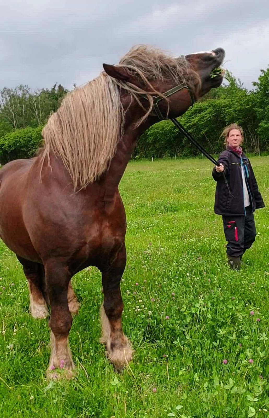 Dann kann es vorkommen, dass man, auch im etwas fortgeschrittenen Alter, neben der bekannten Gallowayherde einen wunderschönen Schleswiger Kaltbluthengst braucht. Dieser soll dem Erhalt der Rasse dienen und für Nachwuchs sorgen.