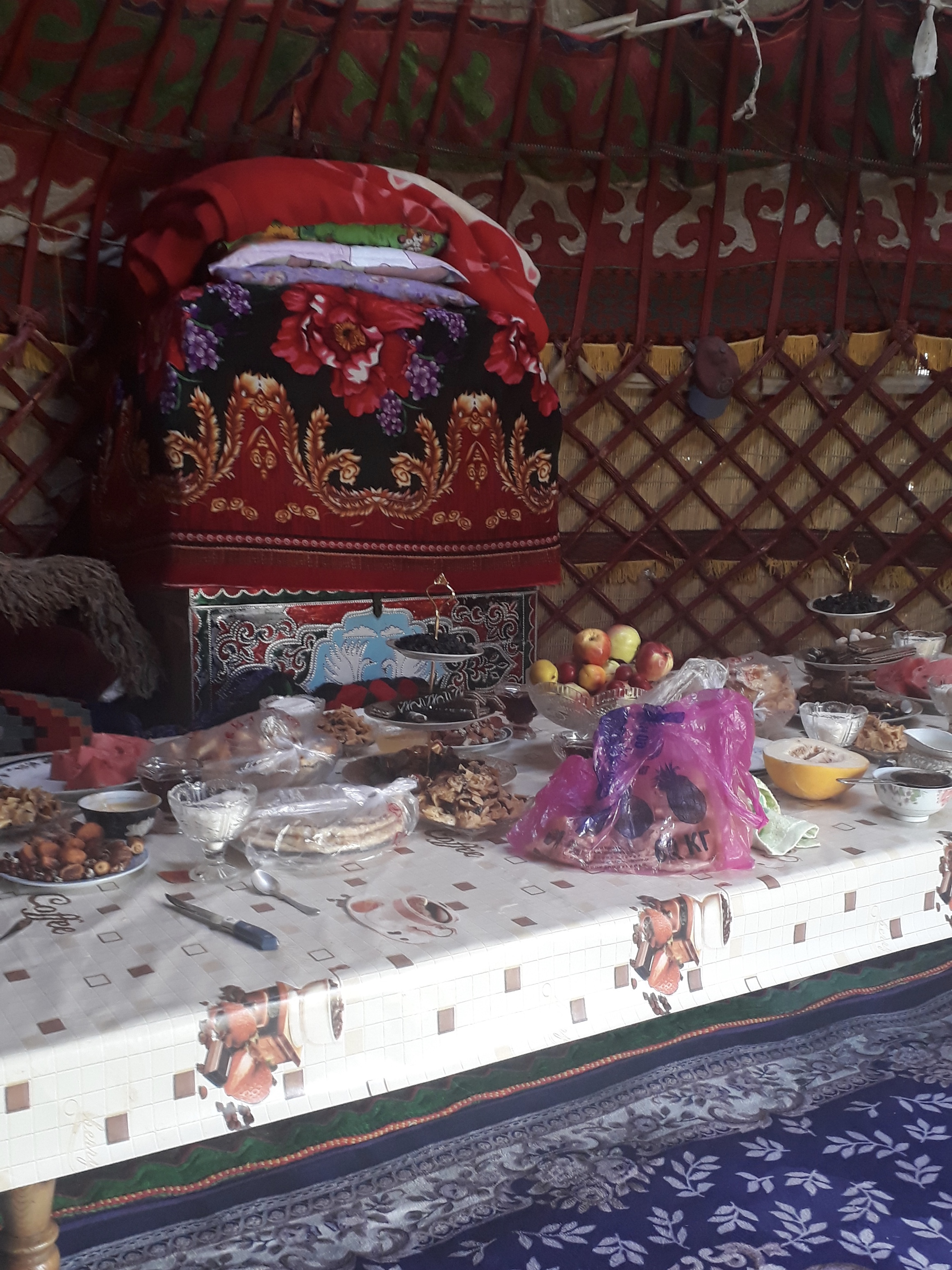 Mir zu Ehren wurde die alte Jurte aufgebaut und festlich hergerichtet. Es gab ein großes Festessen, ich hatte den Ehrenplatz gegenüber vom Eingang und musste alles probieren. Hinterher musste ich aber einen Schlaf zur Verdauung einlegen, weil mein Kreislauf wegen der großen Höhe nicht mehr mitkam. Ich könnte noch viel mehr erzählen, es war eine wunderbare Reise zu rührend netten Menschen.