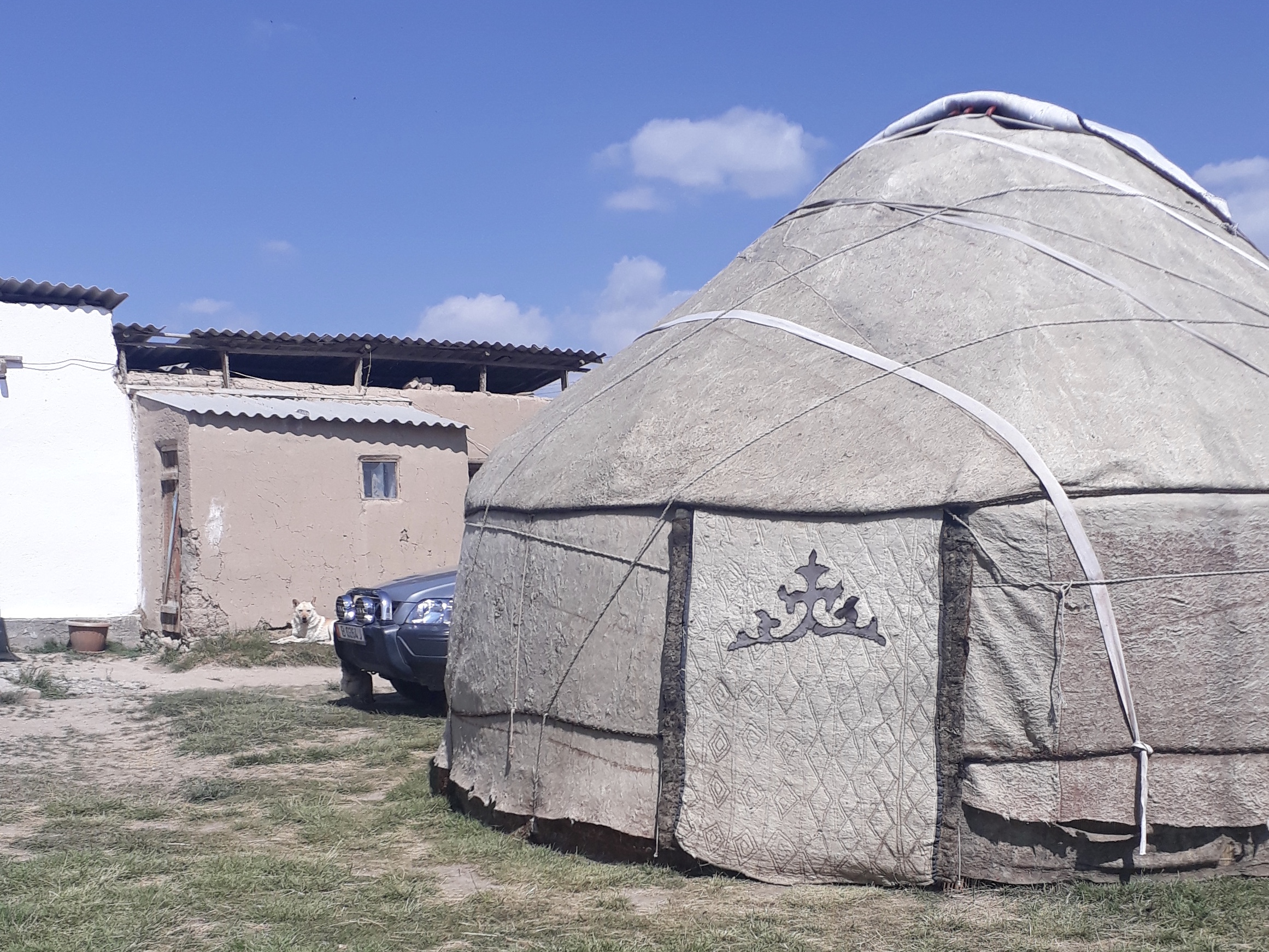 Dort besuchte ich Aichurok auf dem Betrieb ihrer Familie, einsam gelegen in baumloser Steppe auf 2500 Metern Höhe. Man züchtet Pferde, Rinder und Schafe und es gibt ein paar Hühner. Die Tiere werden auf dem Viehmarkt verkauft. Im Winter stehen die Tiere am Hof und werden zugefüttert, es ist bitterkalt, windig und verschneit. Im Sommer werden die Herden höher in die Berge getrieben, wo die Familie angestammte Weiderechte hat. In dieser wegelosen Steppe wird überwiegend das Pferd zur Fortbewegung benutzt, dafür steht stets ein Pferd gezäumt und gesattelt an einem Pfahl bereit. Die Kinder reiten täglich 3 Kilometer ins Dorf zur Schule, die alle Kinder - bis hin zur Hochschulreife - unterrichtet.