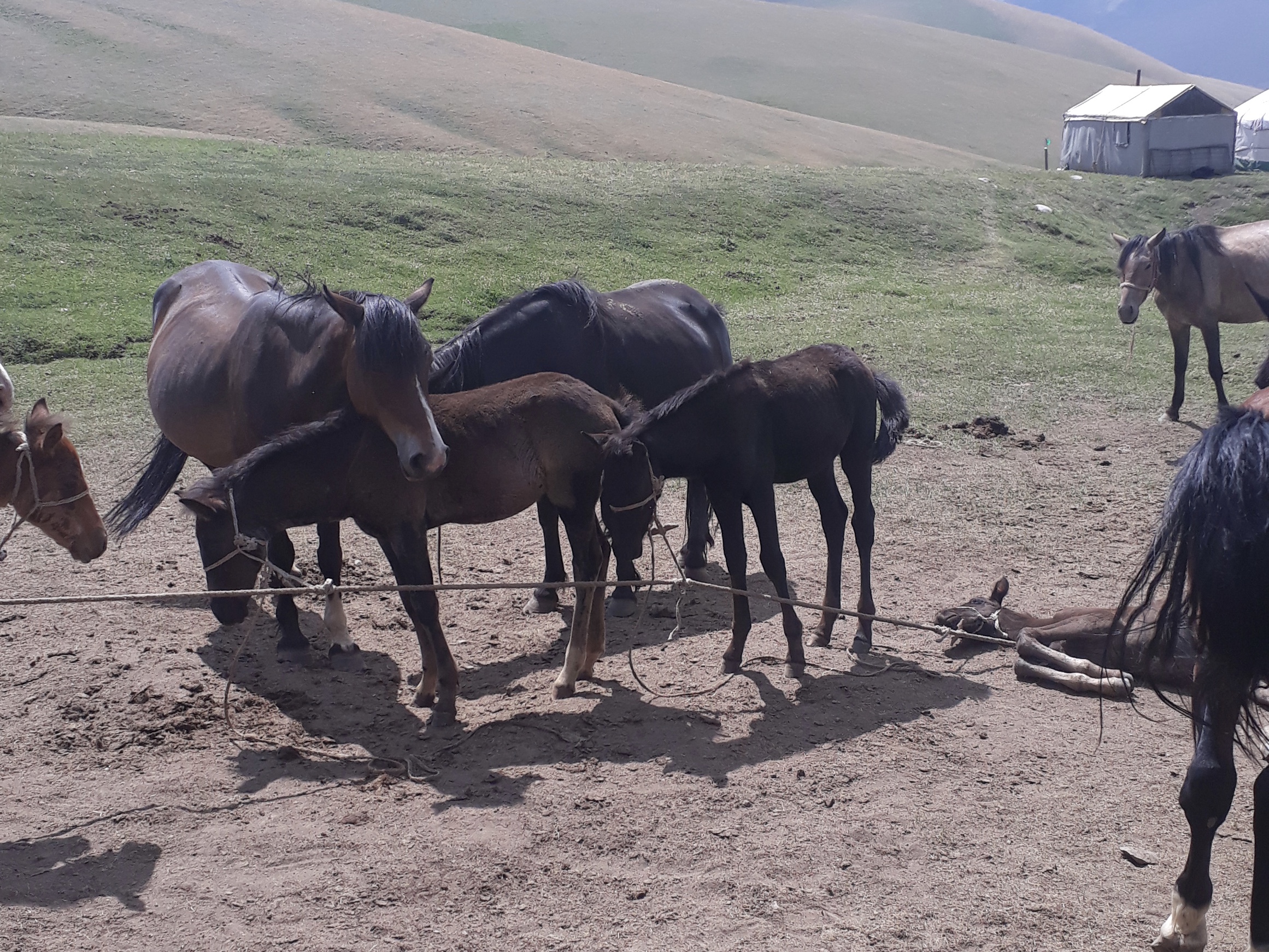 Wir besuchten eine Stutenherde in den Bergen: etwa 15 Stuten mit Saugfohlen bei Fuß und ein Hengst. Die Haltungsform war für mich nur schwer erträglich: an einem langen stramm gezogenen Seil werden alle Fohlen kurz angebunden. Sie können stehen oder liegen, mehr nicht. Ihre Mütter stehen dicht bei ihnen, um ihnen etwas Schutz vor der Sonne zu geben, sie verlassen ihre Fohlen nur zum Fressen.