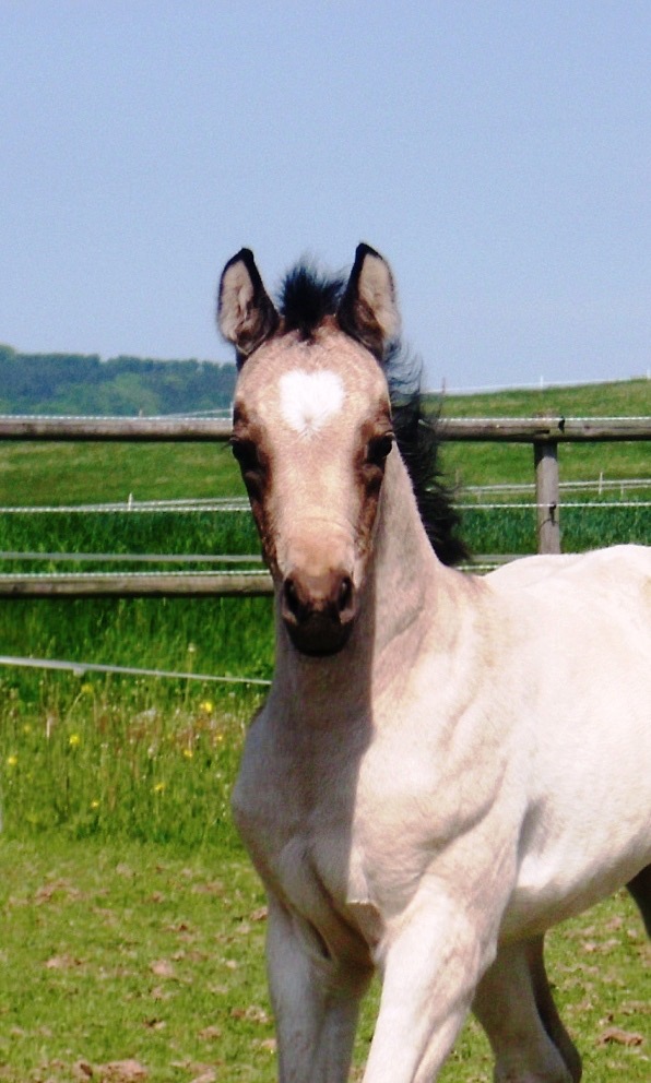 Zum Schluß sagte Rolli, laß uns doch nochmal im Stall Fohlen gucken.... Und da lag sie! Drei Tage alt, braun mit Keilstern und riesigen Augen. Ich konnte nicht anders, alles andere musste rückgängig gemacht werden. Für mich gab es nur noch dieses Fohlen. Rolli Bumann hatte Verständnis, und so wurde ich Besitzerin dieses Stutfohlens von Donauwind aus der Silvetta.