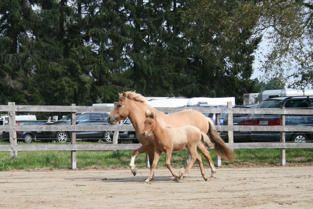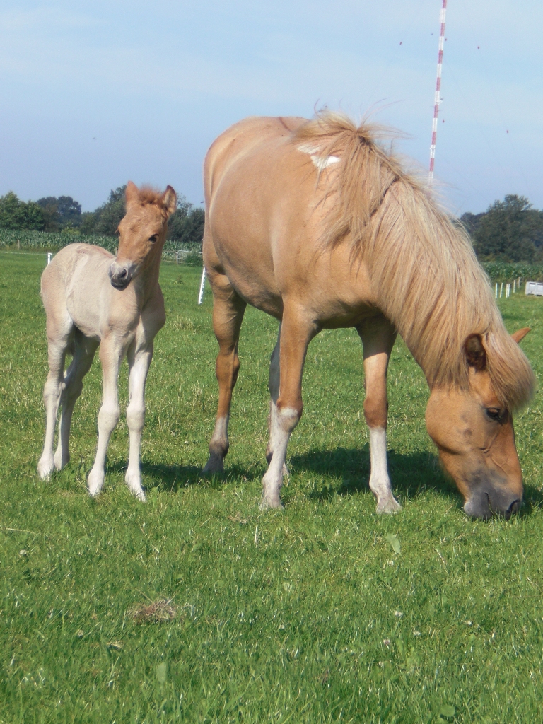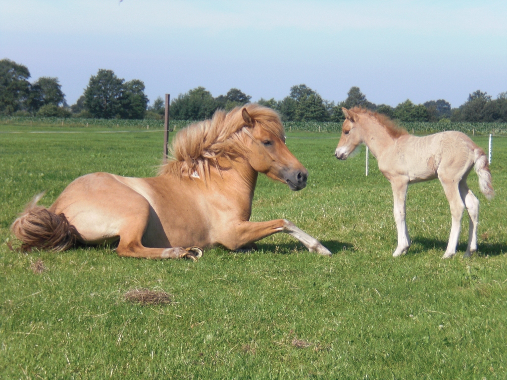 Meine junge Audna, was übrigens Glück heißt, hatte zwischen 10 anderen Stuten, die alle das Fohlen klauen wollte, ihr erstes Fohlen bekommen! Das Fohlen war gesund, groß und gut entwickelt und ein Fuchsfalbe.