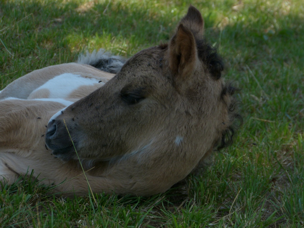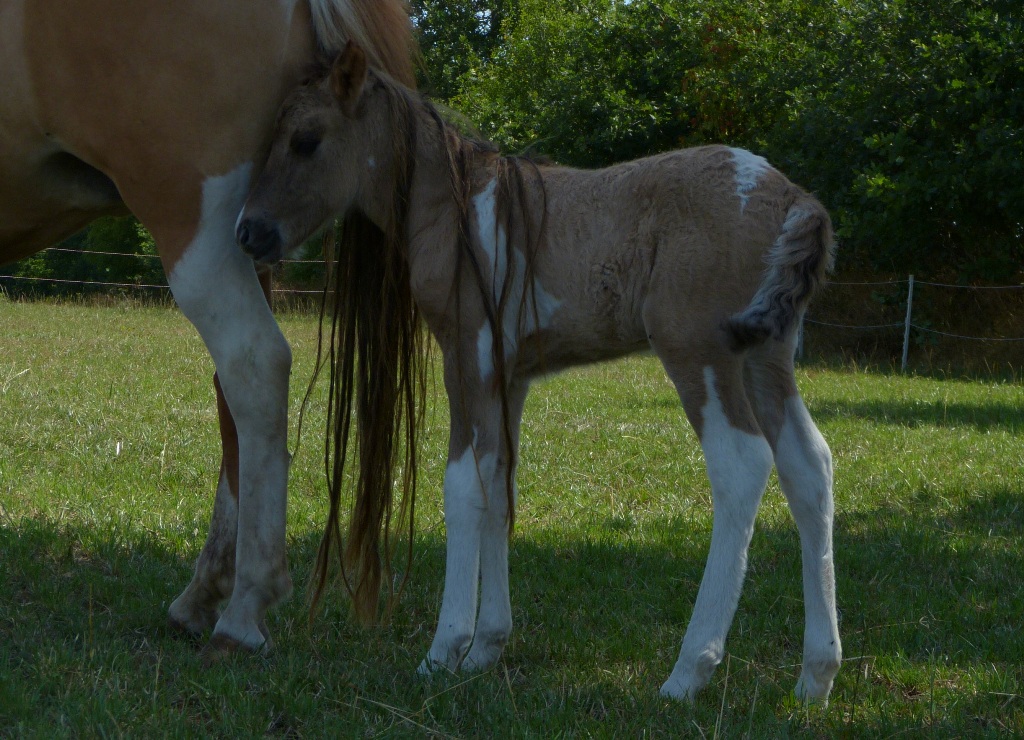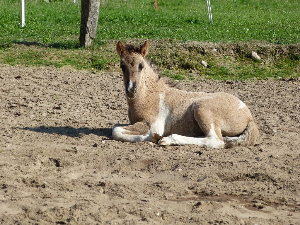 Da ich mir immer schon einen Mausfalbschecke gewünscht habe, paarte ich im Sommer 2017 Audna mit Isleifur v. Kronshof an. Aufregend war's, denn so recht wollte die Trächtigkeit zuerst nicht klappen. Erst spät im Sommer, nahe dem Ende der Weidebedeckung, war die Trächtigkeitsuntersuchung positiv und 11 Monate später, am 28.07.2018 erblickte Mánadis (= Mondschein) v. Kreuzkamp - ein Stütchen in Mausfalboptik und schöner Scheckung - das Licht der Welt.
