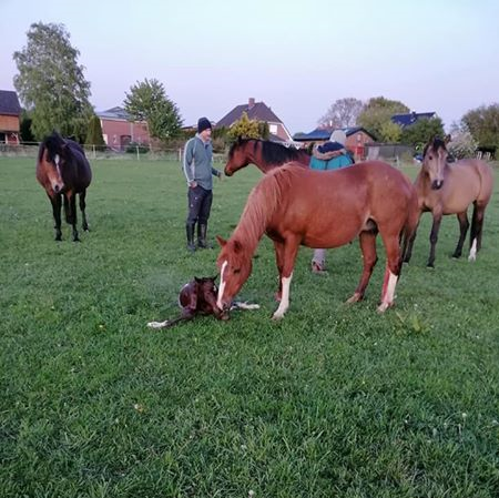 Die Herde hat tatsächlich die Geburt selbst weitestgehend ignoriert. Majeed stand wachend in ca. 10m Entfernung, alle anderen haben gegrast. Nur Rikes 4-jährigen Sohn haben wir sicherheitshalber weggebracht (samt seiner 3-jährigen Freundin, damit er nicht alleine war), weil er doch – seinem Grundnaturell entsprechend – etwas zu interessiert war. Kaum war das Baby da und Rike wieder aufgestanden, waren aber alle hochinteressiert, das neue Familienmitglied zu betrachten. Die Kleine wieherte auch direkt, so dass das kein Wunder war. Als Chefin machte Rike deutlich, dass die anderen doch bitte einen gewissen Mindestabstand wahren – das lief ziemlich friedlich über 2-3 Mal quieken und Ohren anlegen – und wir haben sie unterstützt. So konnte sie sich entspannt dem Trockenlecken des Fohlens widmen. Ganz besonders spannend fanden Goldi und Ginette – unsere anderen beiden Zuchtstuten – das kleine Ding. Goldi muss auf ihr eigens allerdings noch bis Ende Juni warten und Ginette bis nächstes Jahr.